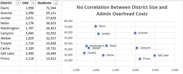Are administrative overhead costs more for smaller districts? Not according to the numbers in ASD’s slide. See the attached chart, and note that there is no correlation between district size and admin overhead costs, at least for districts in Utah over 13,000 students.