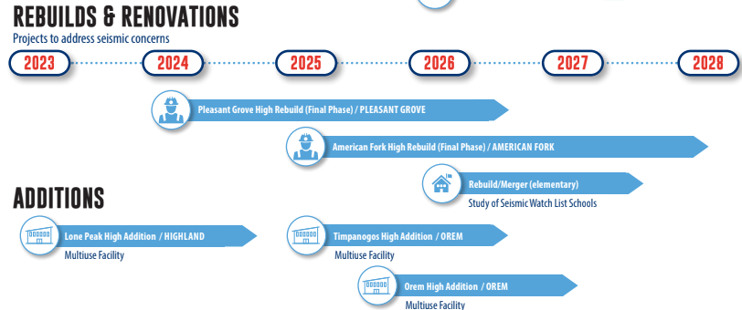 The 2022 proposed bond from ASD would have been directed to fix the two high schools. Additionally, there was an elementary rebuild or merger proposed, most likely for schools in Orem. The bond failed, however, so these projects have not been carried out.